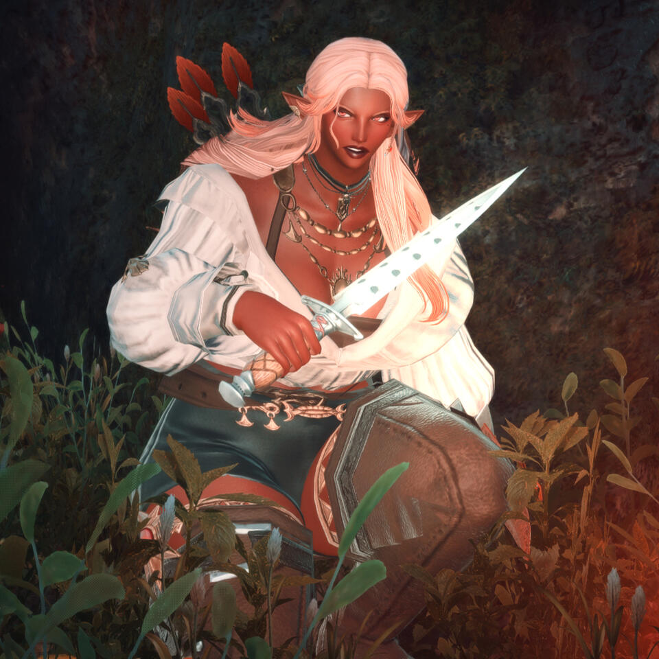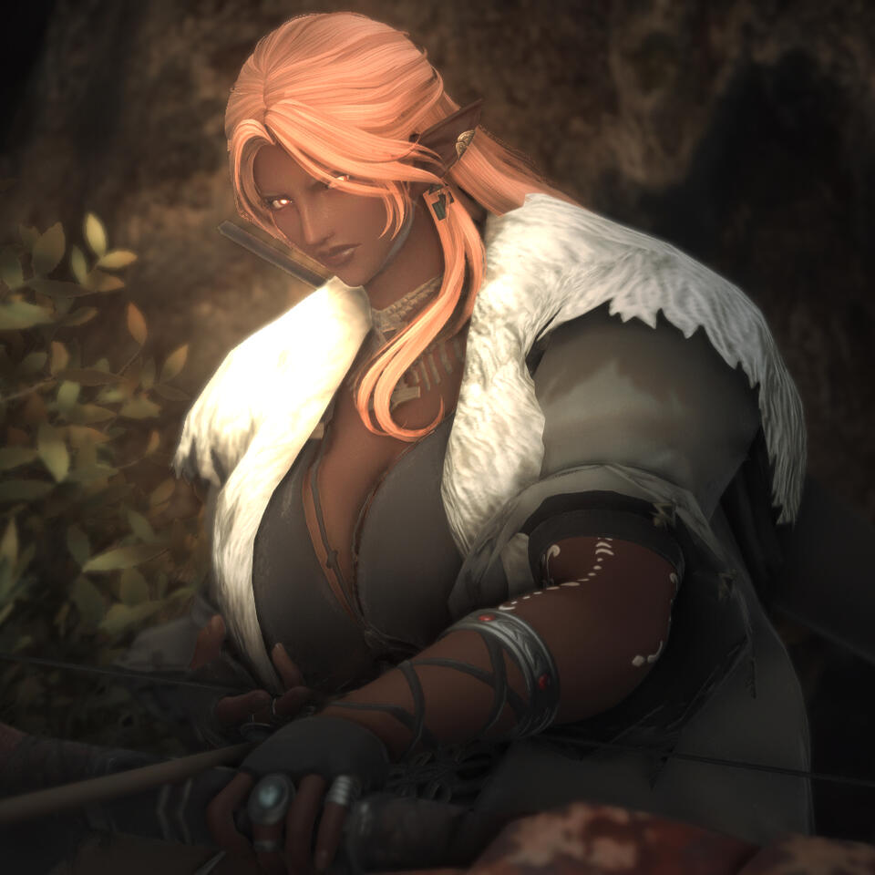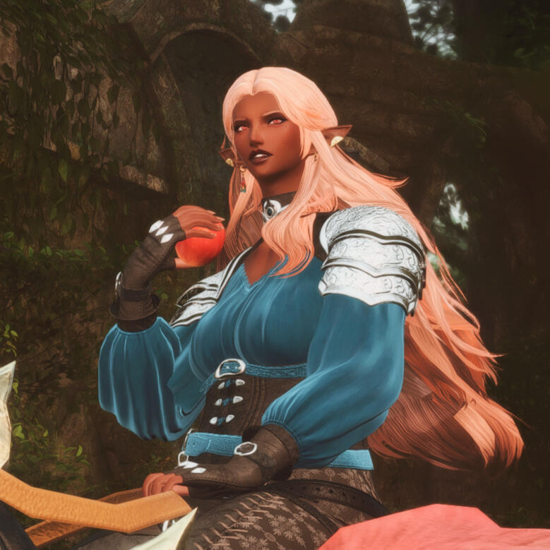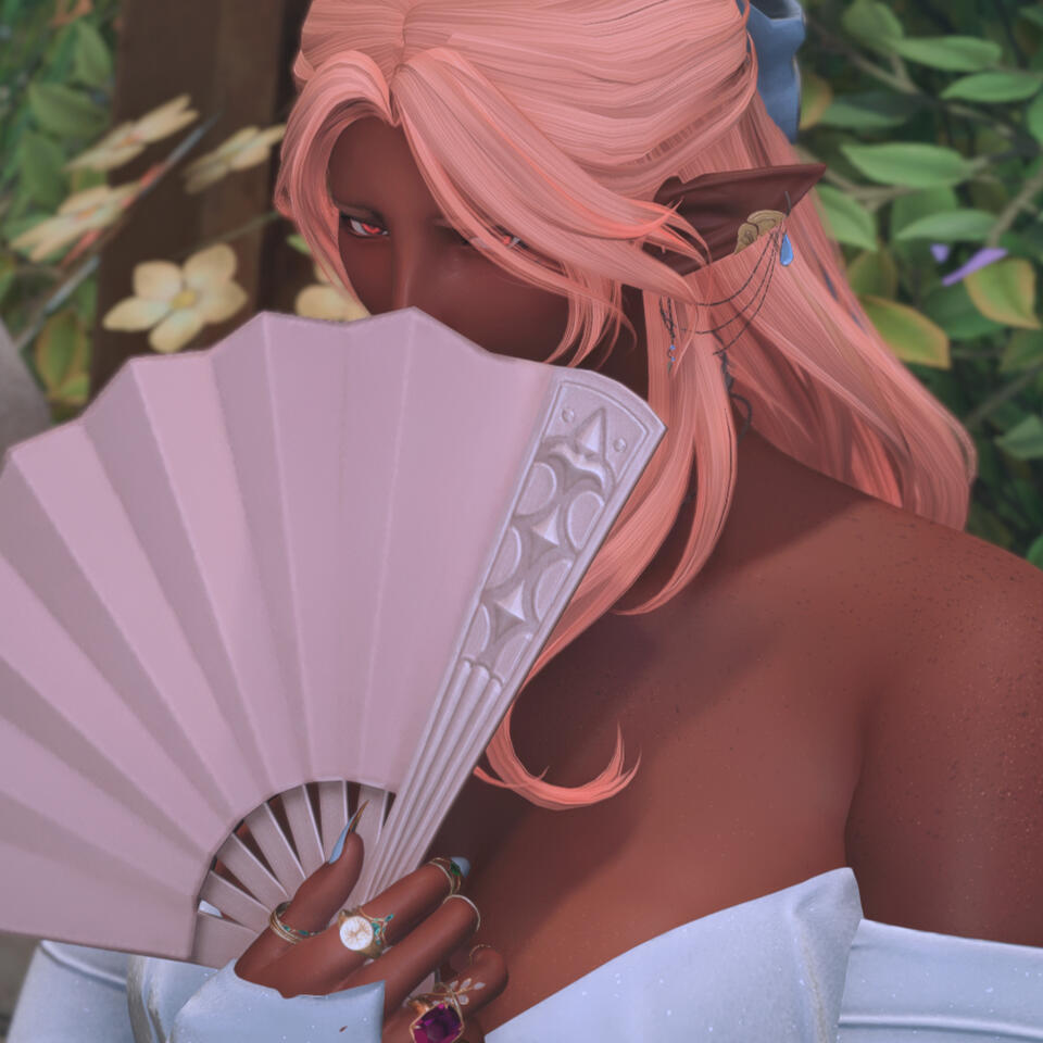 a quick summary. Siobhan was born to her Hellsguard mother in the Dravanian hinterlands, to her Sharlayan father within the old settlement there. When she was but four years old, she awoke one day to her father abandoning her mother and her - Sharlayan had called him back to the homeland, and he had little care to bring back the family he'd started. Left alone, Siobhan and her mother returned to the tribe of Hellsguard that roamed the mountains of Dravania. And one day, she was pulled aside by her grandmother, and had a gift thrust upon her that would change her life forever - the gift to collect memory from places, from items, and from people, should these things have enough emotion attached.She's made it her life's work to collect memories long forgotten through this gift. People and their proclivities are her keenest interest, learning their lives and their stories so she might preserve and retell them in song for futures that may never know them if not for her. To Siobhan, to forget is to die, and preserving memories of those who have forgotten their own or have passed on before they could share their tales is the single most important task.Endlessly she travels across the many continents of Etheriys with her companions - a chocobo, Sostenuto, and a little white whittret, Banana. She's chronically unemployed, taking odd jobs here and there and often hunting for Clan Centurio to make what little coin she keeps or busking on the streets and stages of the myriad city-states of the world.Though she may seem like sunlight personified, grief everlasting walks with her like her own shadow. A melancholy lives in her that sits like ice in her chest, keeps her from warming to others fully. Ever keeping herself at arm's length, she still longs for connection - and often finds herself tripping over her own feet to try.